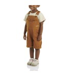 Uncomplicated. Just pure toughness. That's how you describe your young adventurer as well as these babies' canvas ruffle overalls. Coincidence? No, it's Carhartt. So durable, they're future hand-me-down champions.