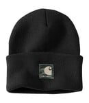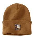The acrylic watch hat is one of the most iconic pieces we make. This version of the A18 has a camo patch. It's made of soft, stretchy rib knit that keeps out the cold.