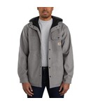 Keep it moving through light rain, wind, and cold. This men's Carhartt shirt jac is a rugged layer for days you need full coverage and full range of motion. The heavyweight twill is fleece-lined for warmth and has a roomy three-piece hood. There are two chest pockets for essentials as well as two handwarmer pockets in front.