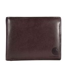 This men's bifold wallet has a simple, old-school design. It's made of durable full-grain leather with a rich oil finish that has a slight shine. An embossed Carhartt logo is its seal of quality.