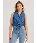 When it's too warm to wear your go-to western snap shirt, our women's denim sleeveless tie front shirt will be the next best option. This classic summertime staple is crafted from cotton for comfort and comes with all the iconic details, including two chest flap pockets with the 'W' embroidery, western front and back yokes, a pointed collar, and a full pearl snap closure. It's cut to the perfect length for wearing with your favorite high-rise Wrangler® jeans or shorts. Plus, it ties at the waist for a relaxed feel. Finish the look with some turquoise jewelry.